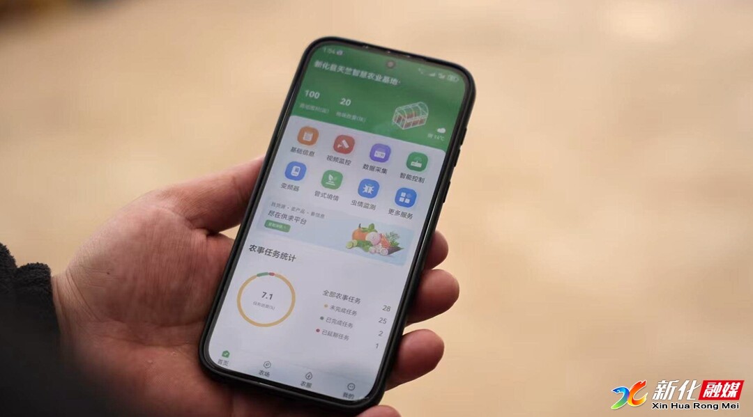 在天竺农业科技有限公司,管理员在手机上轻轻一点,几百米外的大棚顶膜就开始缓缓展开,再轻轻一点,自动喷淋系统启动,将水滴精准灌溉到作物上,这是天竺育秧连栋大棚智能化建设近期的成果之一。